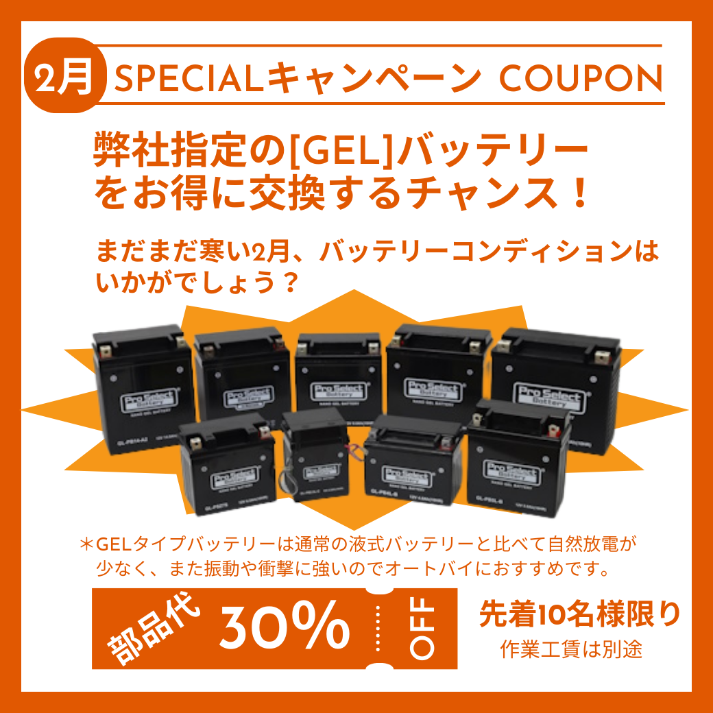今月は弊社で愛用しておりますGELバッテリーを通常販売価格の30%OFFで販売・交換させていただきます。