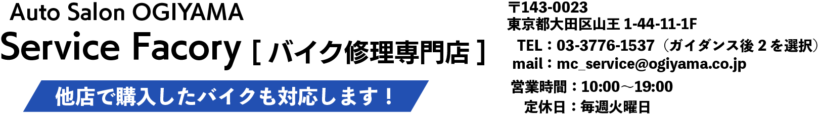 弊社にてご購入いただきましたバイクはもちろん、他店ご購入車両の整備・車検・カスタムなども承ります。 ![]() オートサロンオギヤマ・サービスファクトリーについて