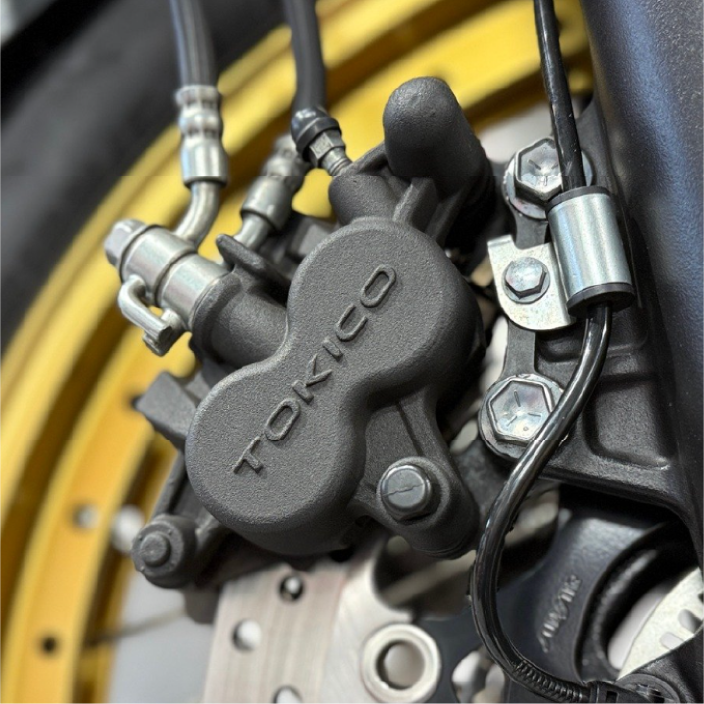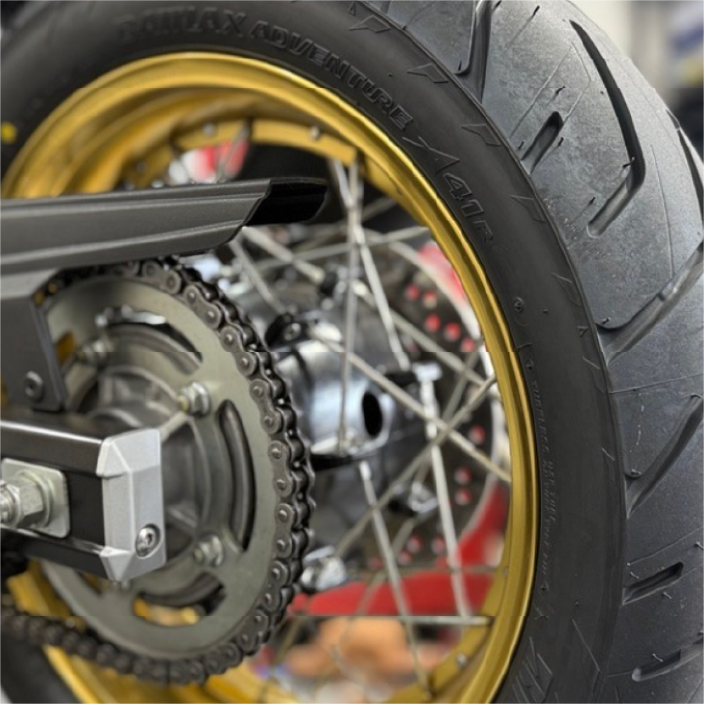 オートバイ店のブレーキパッド交換は部品交換だけではなくピストンやスライドピンの清掃やグリスアップなども行います。パッド交換後はピストン/キャリバーの性能も回復されます。 ![]() タイヤ交換
